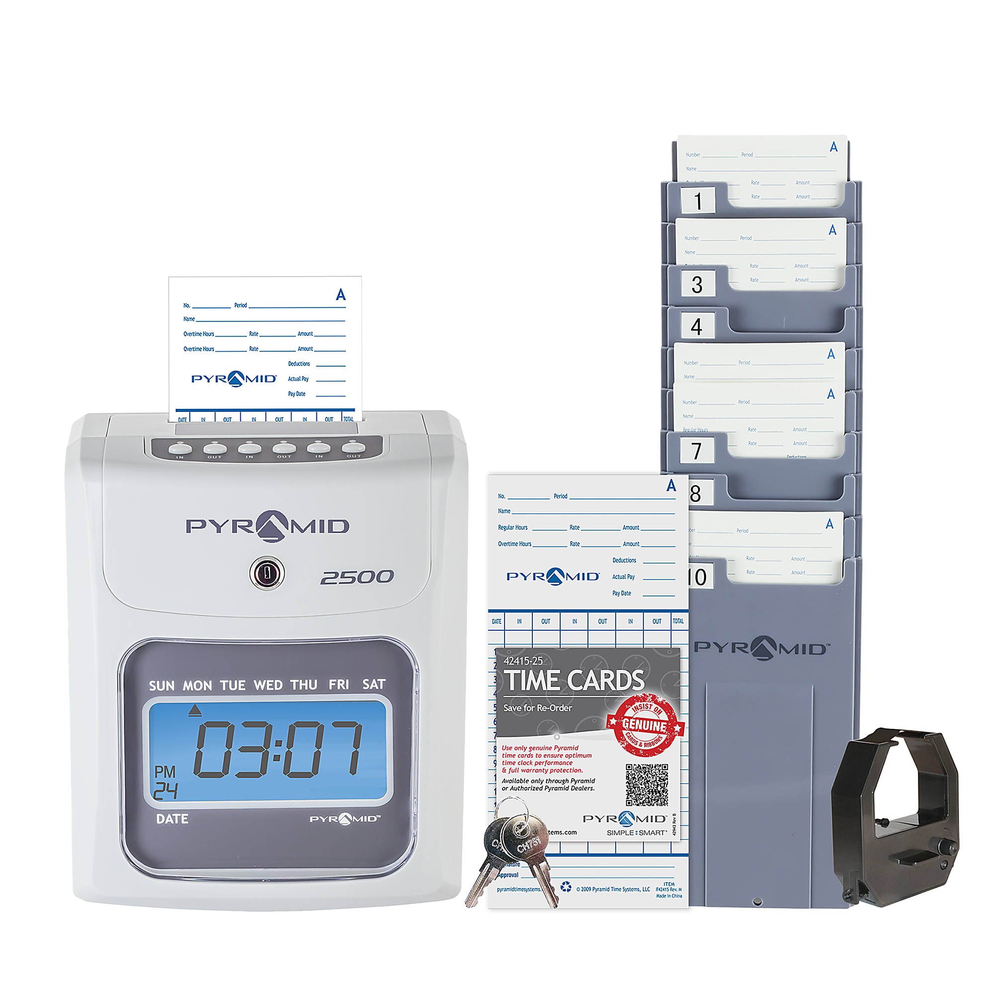 The Pyramid Time Systems Small Business 2500 Time Clock Bundle is designed to efficiently track employee arrival, breaks, lunches, overtime, and departure times, supporting unlimited employees. Featuring a six-column, two-sided time card that handles three In/Out punch intervals per day, this time clock ensures accurate time and attendance recording for each pay period. Its top-loading, automatic aligning time card feed and auto-detection features prevent errors and simplify usage. The device supports both 12-hour (AM/PM) and 24-hour (military) time formats and offers an easy-to-read backlit LCD displaying time, date, and day of the week. With an internal battery backup, it safeguards data for up to seven days during power outages. This bundle includes 100 time cards, an ink ribbon, a 10-slot employee card rack, and two security keys, all secured by a tamper-proof lock. Additionally, it features automatic resets for short months, leap years, and Daylight Saving Time, making it a reliable and low-maintenance solution for small businesses.