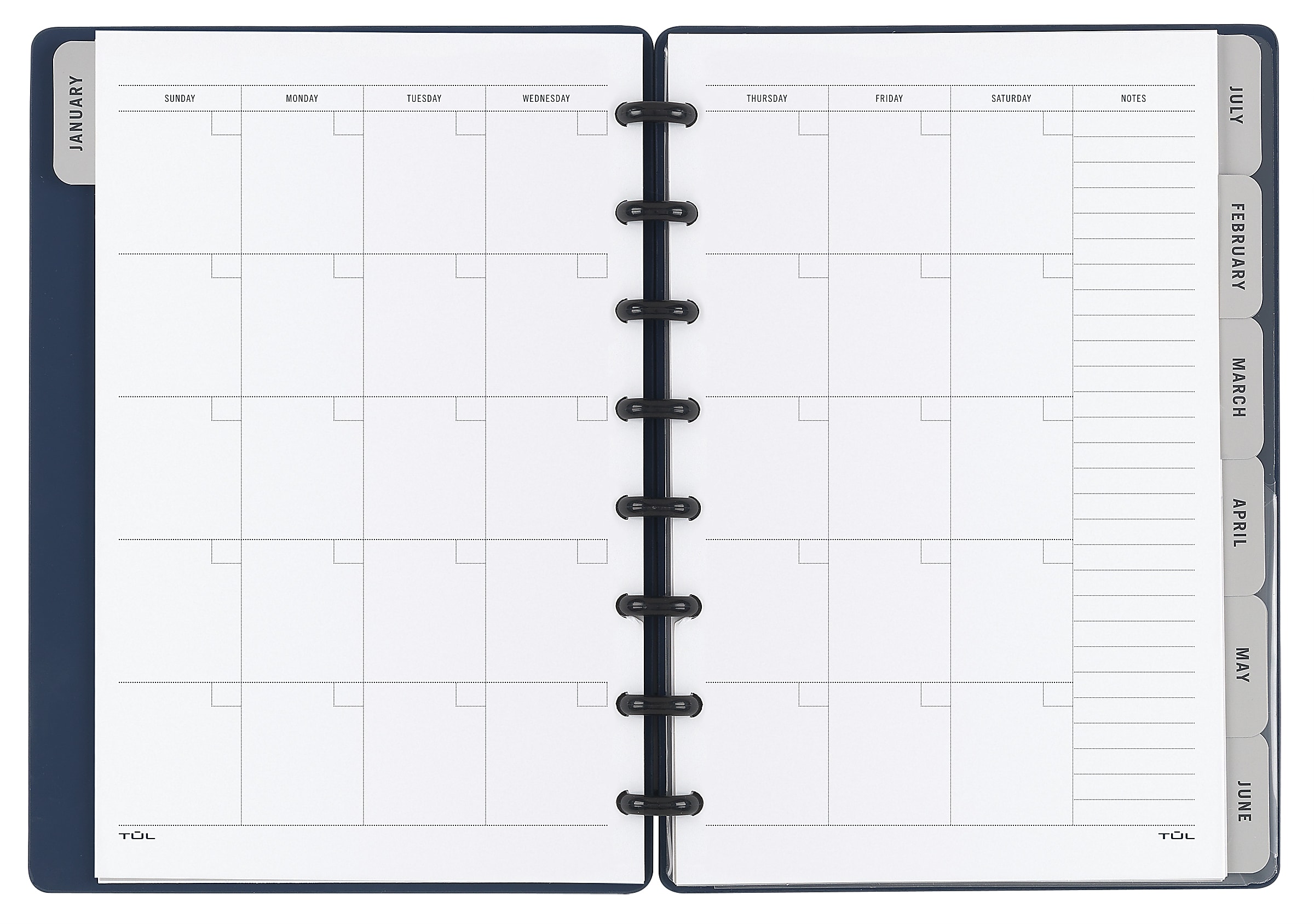 Stay on top of your schedule, to-do lists, and more with this customizable TUL® Discbound Monthly Planner Starter Set. Featuring undated monthly calendar pages with 2 pages per month, this planner includes 12 monthly tabbed dividers for easy navigation, a 2-sided poly pocket for keeping essentials, and a sticker sheet to personalize your planner. The stylish soft-touch navy cover provides a professional feel, while the discbound design with 3/4″ discs allows you to easily add or remove pages to suit your needs. This refillable planner is designed for continued use, helping you avoid single-use disposables and potentially save money.