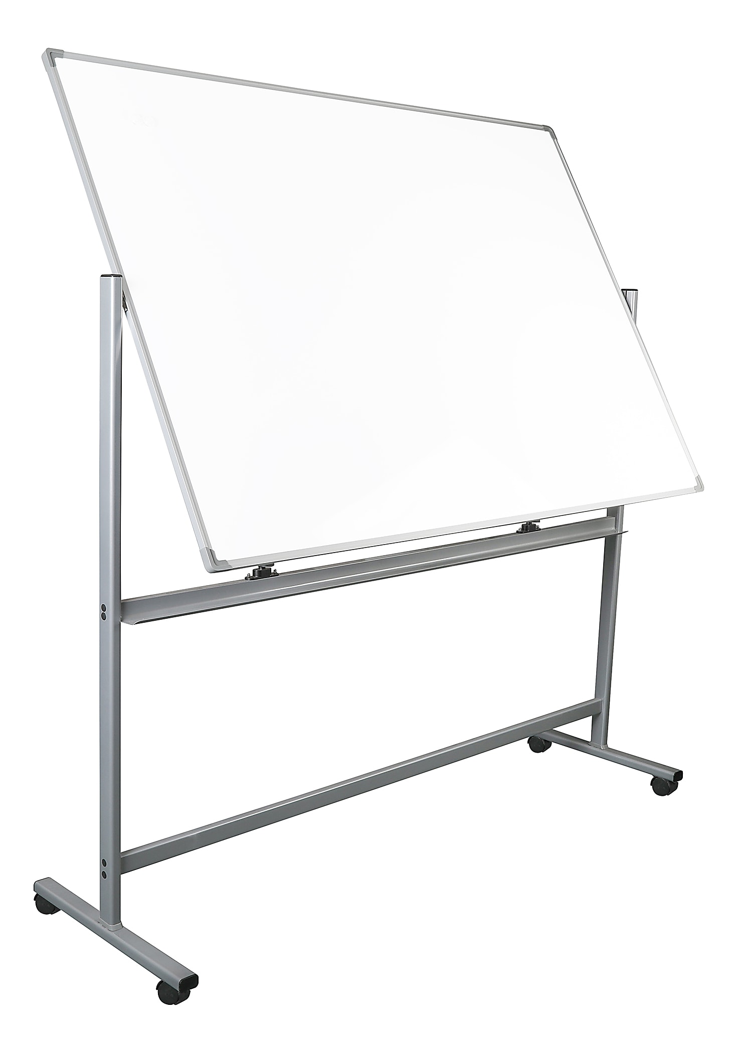 Mobile whiteboard has four locking casters to keep the board permanently in place when needed.
